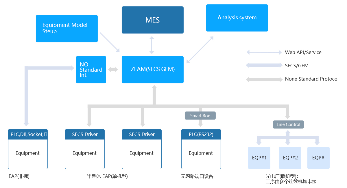 开放统一的接口协议,支持各种标准和非标自动化设备的快速接入与部署,涵盖设备基础运营信息管理,生产过程自动化控制,数据收集及运维分析的数字化平台。