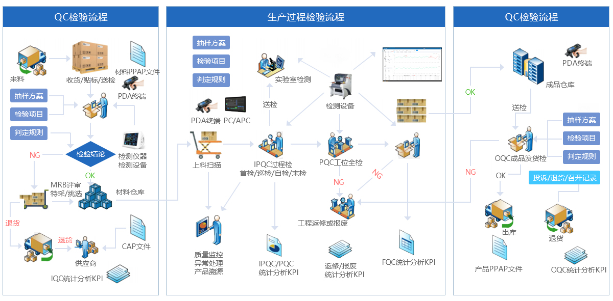对产品的原材料、生产过程、生产设备、生产工艺、生产环境等环节进行数据采集,实现整个产品的质量可追溯性,当产品质量出现问题时,能够对问题产品进行及时定位。